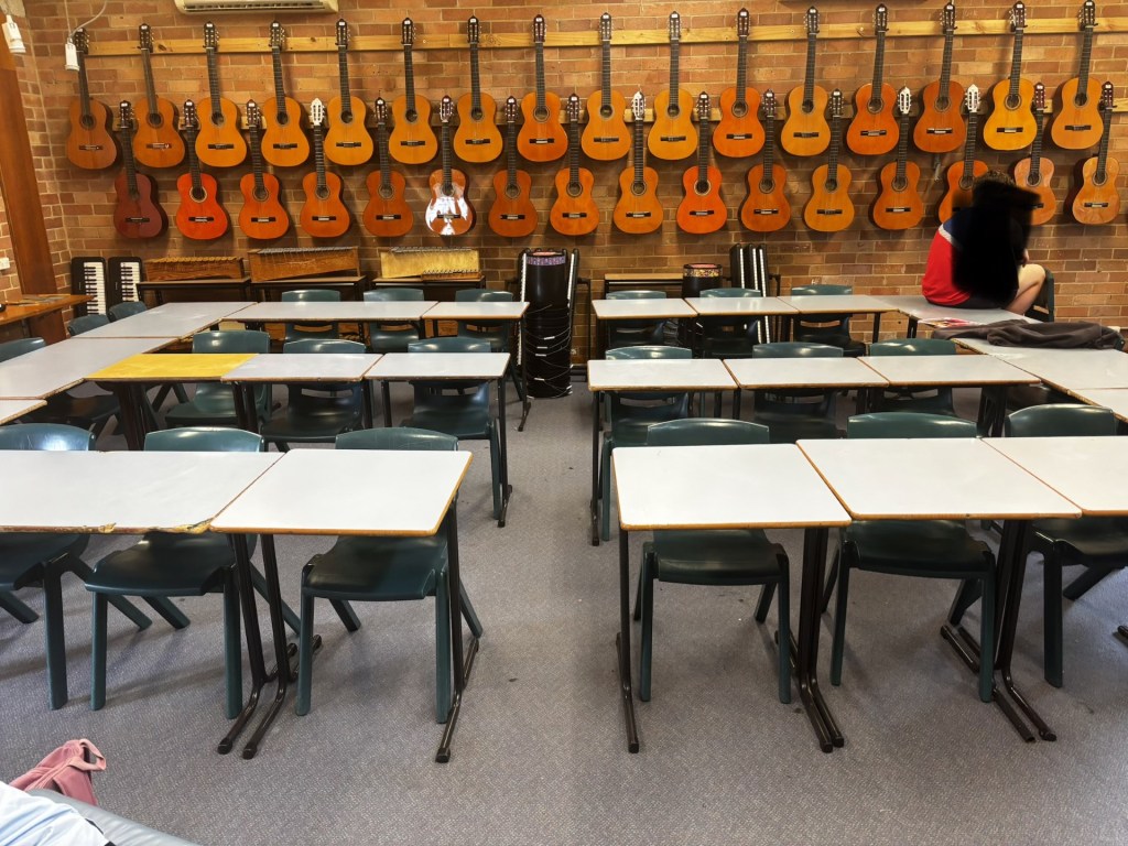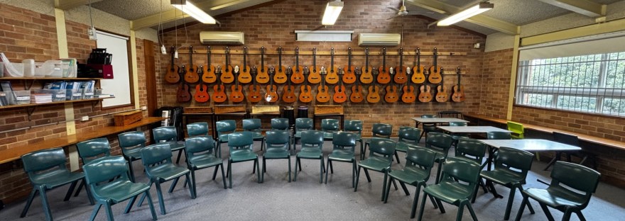 When students walk into the room now, they immediately see guitars hanging on the wall, instruments ready to be played and chairs arranged for ensemble work. Bags are placed to the side of the room, and the seating arrangement intentionally means the student’s body language is open and no longer hiding behind desks.